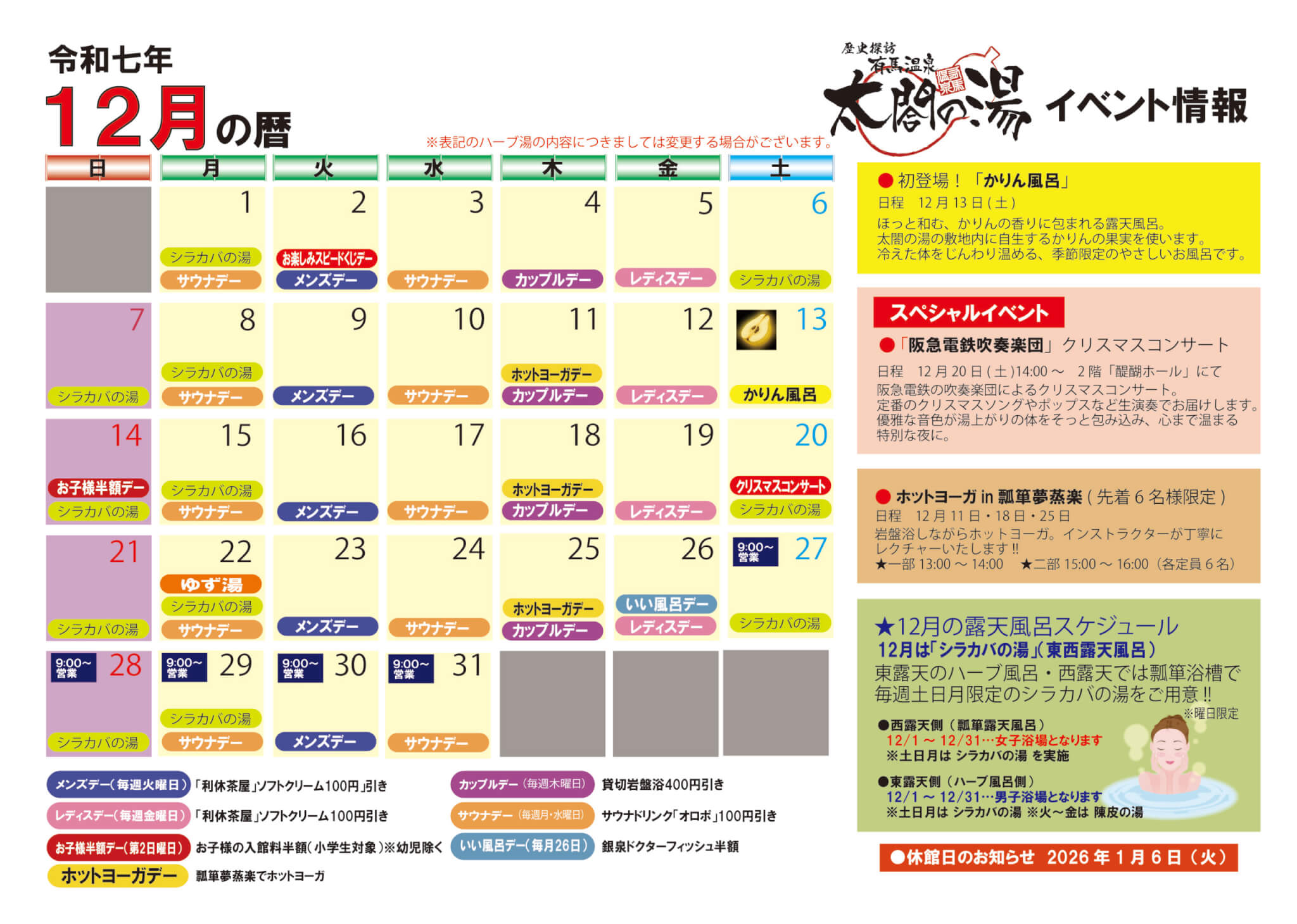 Open from 9:00 AM from Saturday, December 27th to Sunday, January 4th!!! *Normally open at 10:00 AM Taiko no Yu special opening hours 9:00 AM